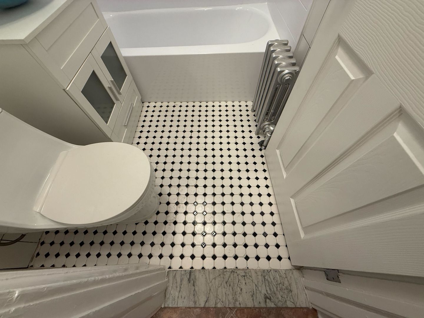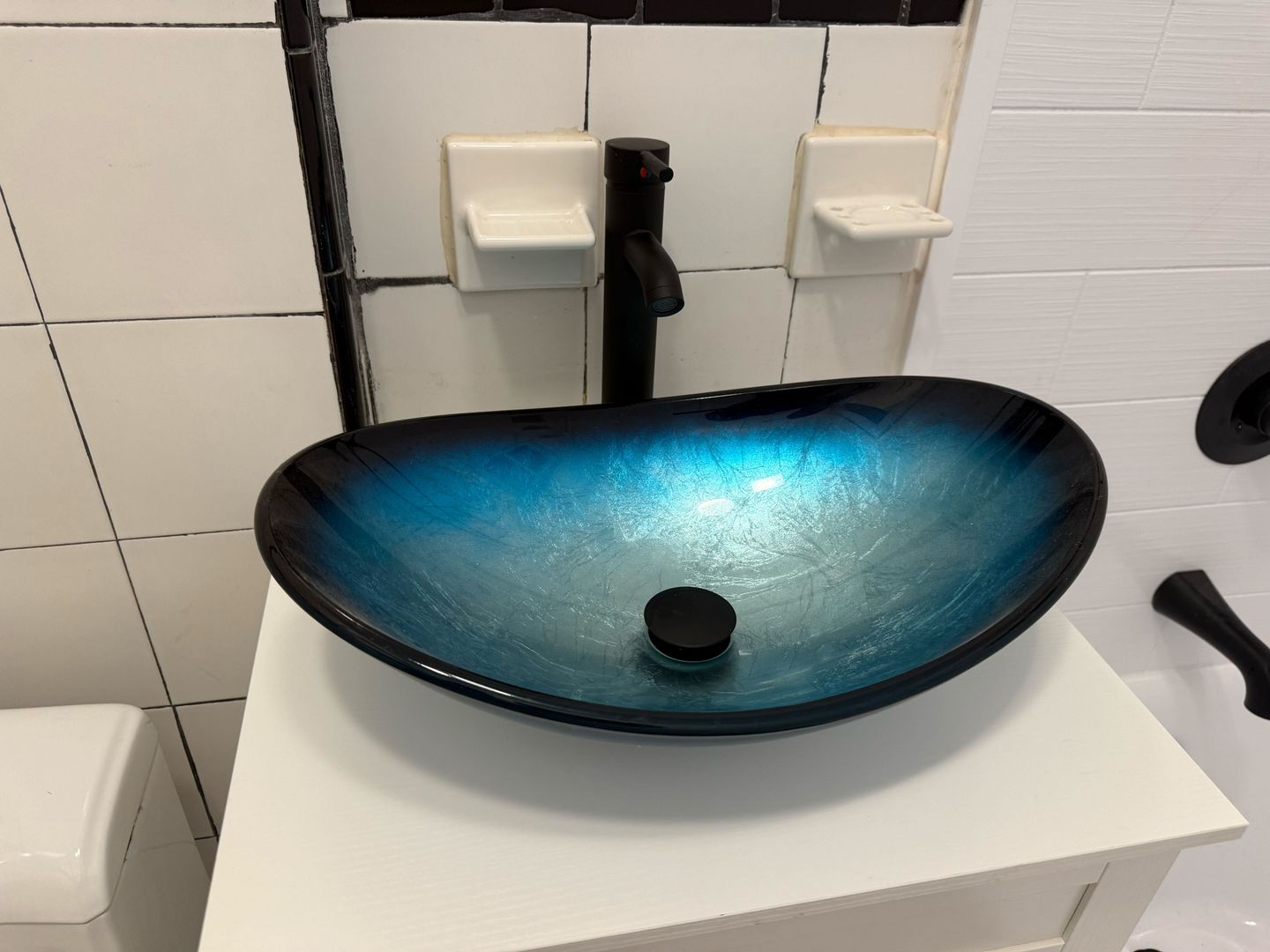Spa-like bathroom with blue glass vessel sink, matte black fixtures, and classic black & white octagon mosaic floor